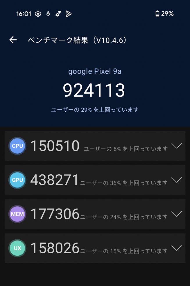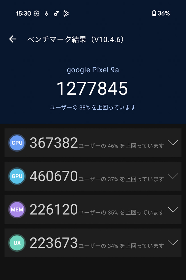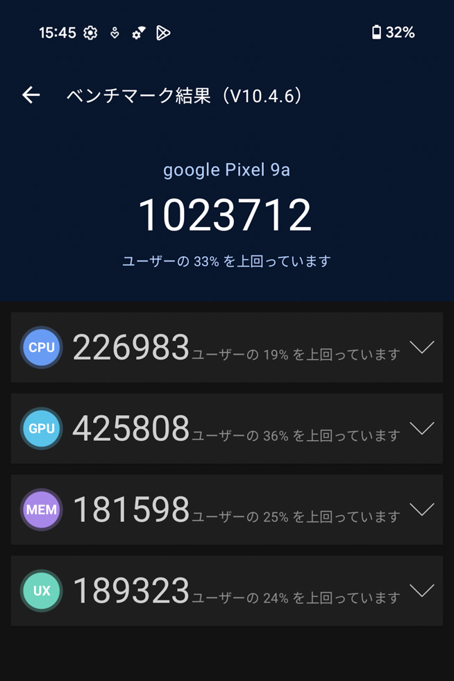 以上、Google Pixel 9aのAnTuTuベンチマークのチェックでした。
