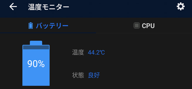 ただし、発熱はそれなりに強くゲーム終了時点で約44.2℃となっていました。バッテリー消費は約10%(100%→90%)です。