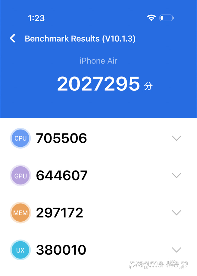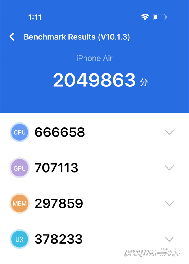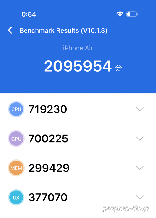 Appleの超薄型スマートフォン「iPhone Air」を購入したので、AnTuTuベンチマークで処理性能を測ってみました。