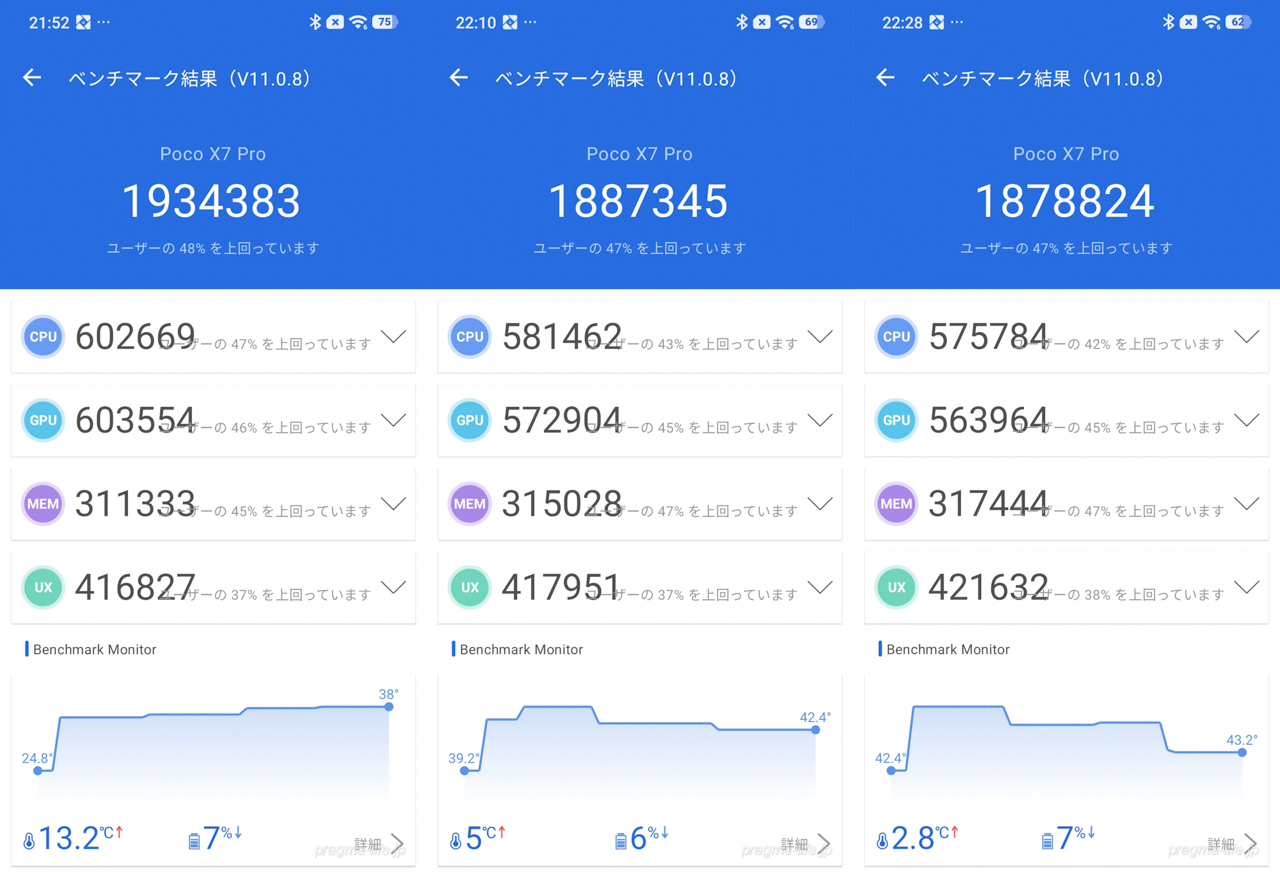 また、比較のために筆者所有の前モデル「POCO X7 Pro(Dimensity 8400-Ultra)」でも同様に計測してみました。