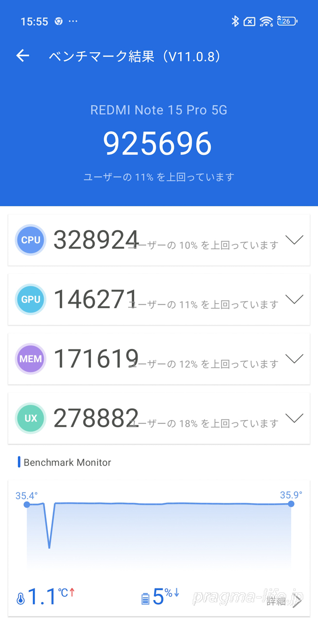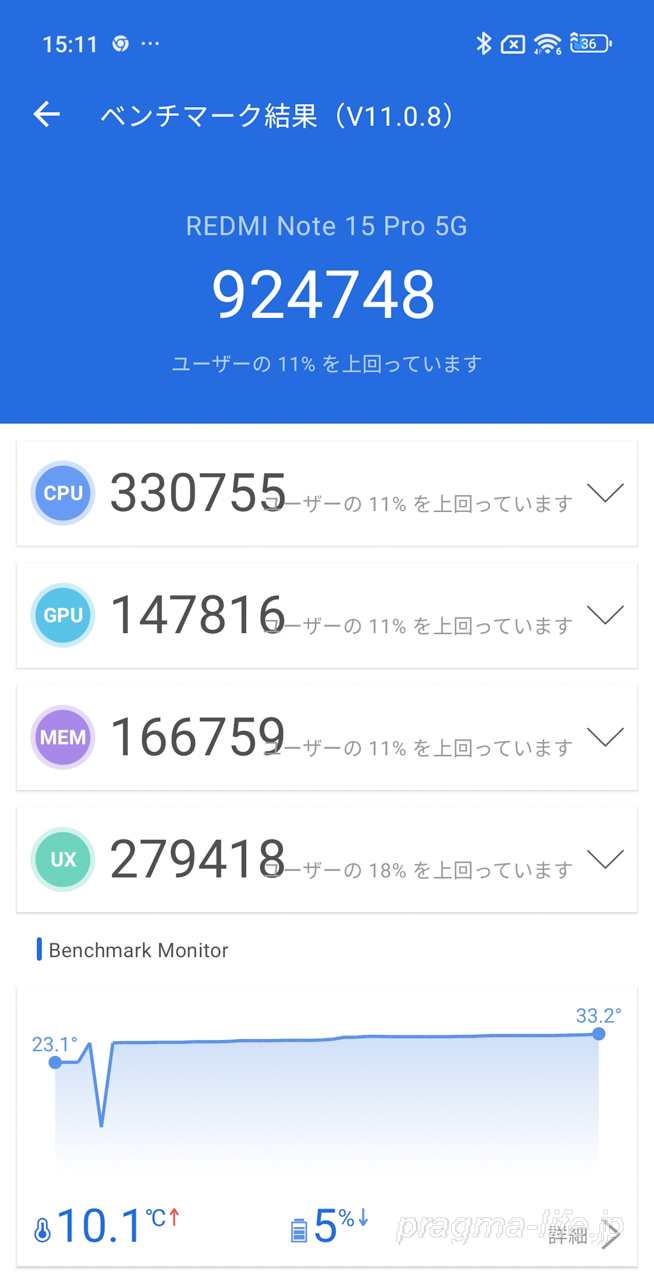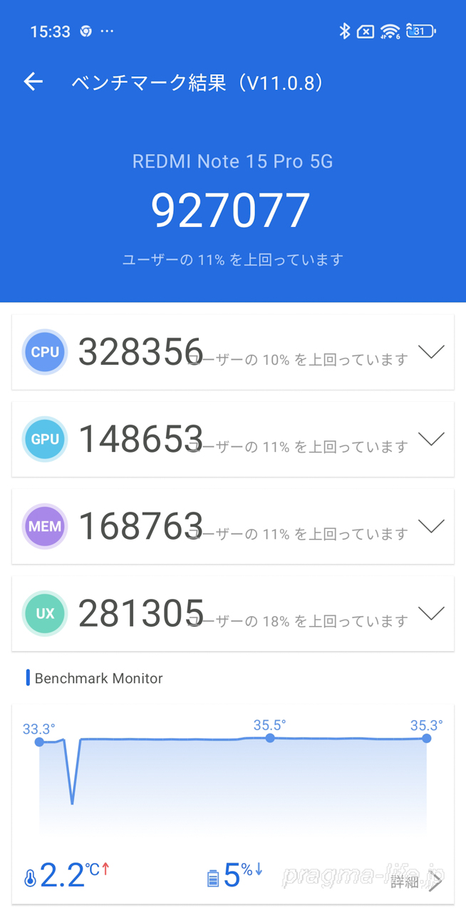 以上、REDMI Note 15 Pro 5GのAnTuTuベンチマークのチェックでした。