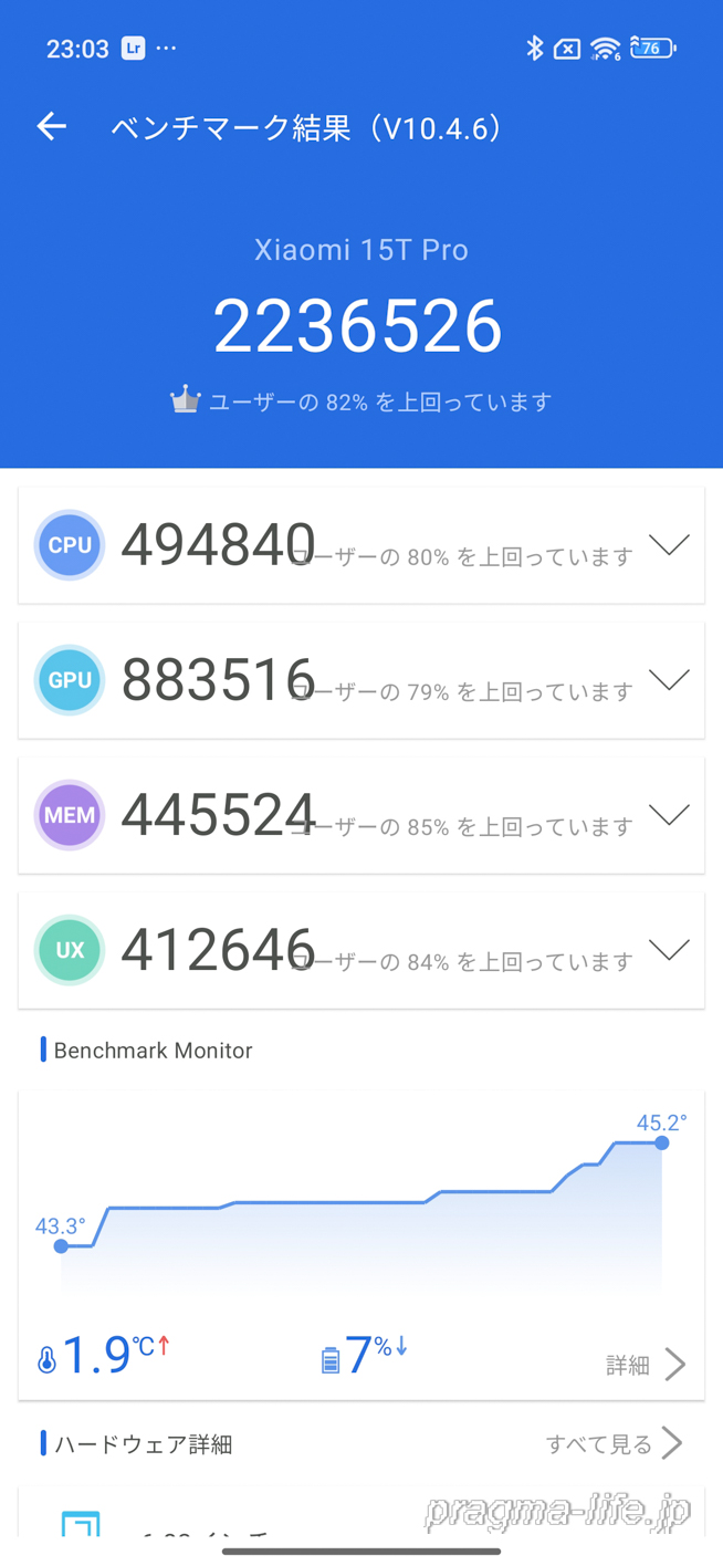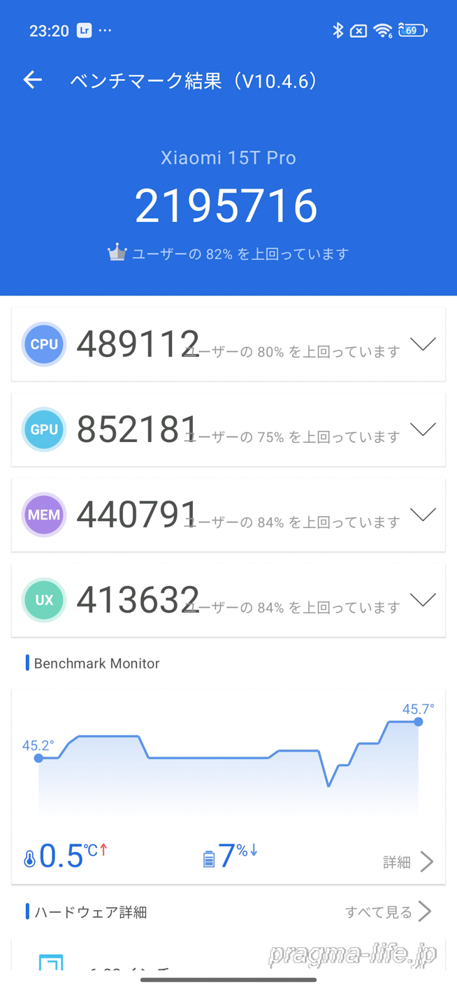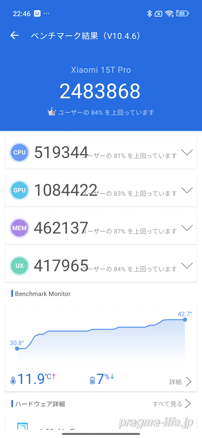 以上、Xiaomi 15T ProのAnTuTuベンチマークチェックでした。