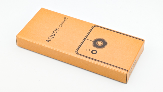 AQUOS sense8のパッケージは少しツヤがありますが、段ボールです。