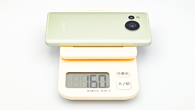 AQUOS sense8の重量は公称159gです。重量を計測してみると160gでしたが、誤差の範囲内でしょう。