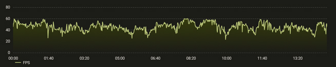結果は、ミドルレンジモデルとは思えない平均約45FPSのフレームレートを発揮。温度上昇も15分で約9℃の上昇に留まっています。