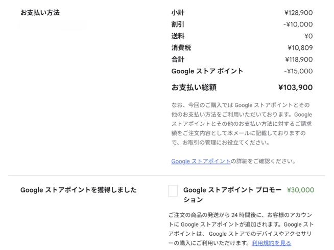 さらに30,000円相当のGoogleストアポイントがもらえたので、これも踏まえると実質73,900円でした。