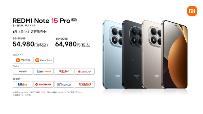Xiaomi公式サイト(mi.com)での、REDMI Note 15 Pro 5Gの価格は税込54,980円~。Amazon、Xiaomi公式 楽天市場店などでも購入可能です。
