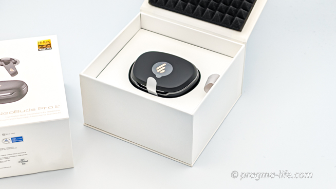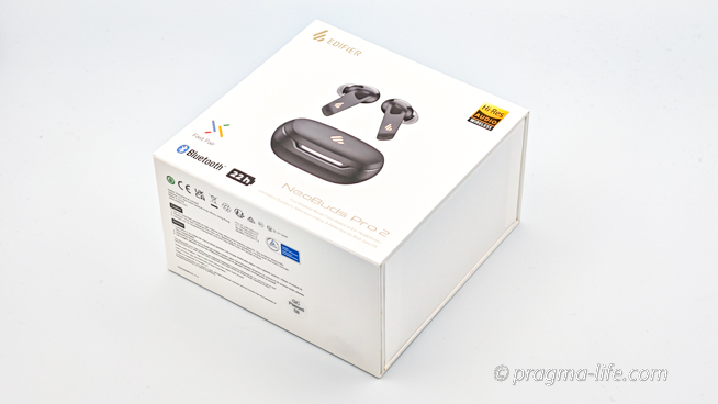 それではさっそくEDIFIER NeoBuds Pro 2を開封していきます。パッケージは本体イメージが描かれている他、Hi-Res認証のロゴ等があります。