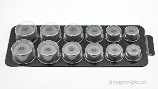 イヤーピースはMサイズが本体に装着済み。そのほか、7つのサイズのイヤーピースが付属しています(合計8サイズ)。