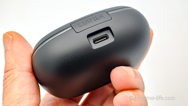 ケース背面には充電ポートがあります。ワイヤレス充電は非対応のため、こちらからケーブルで充電する必要があります。