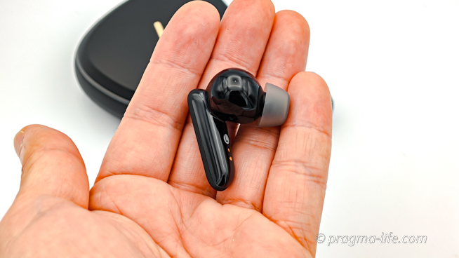 イヤホンを背面から見ると一般的なスティックタイプのようなデザイン。耳や皮膚にあたる部分は丸っこいので、装着感は悪くないでしょう。
