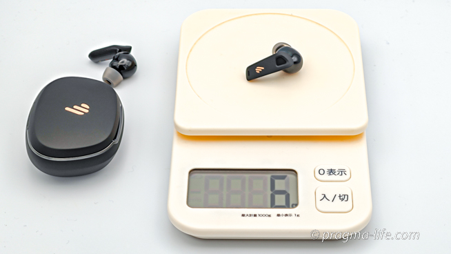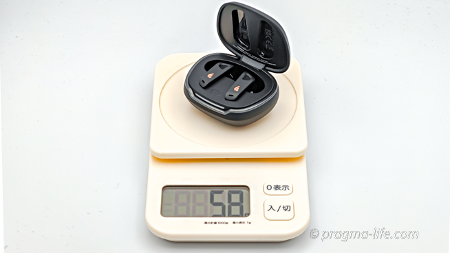 また、ケース込みで約58g。完全ワイヤレスイヤホンとしては重くもなく軽くもない部類でしょうか。
