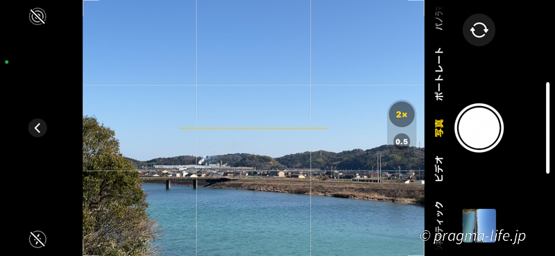 一つめのコツはカメラアプリの設定で、グリッド線と水平器(水準器)を出すということです。