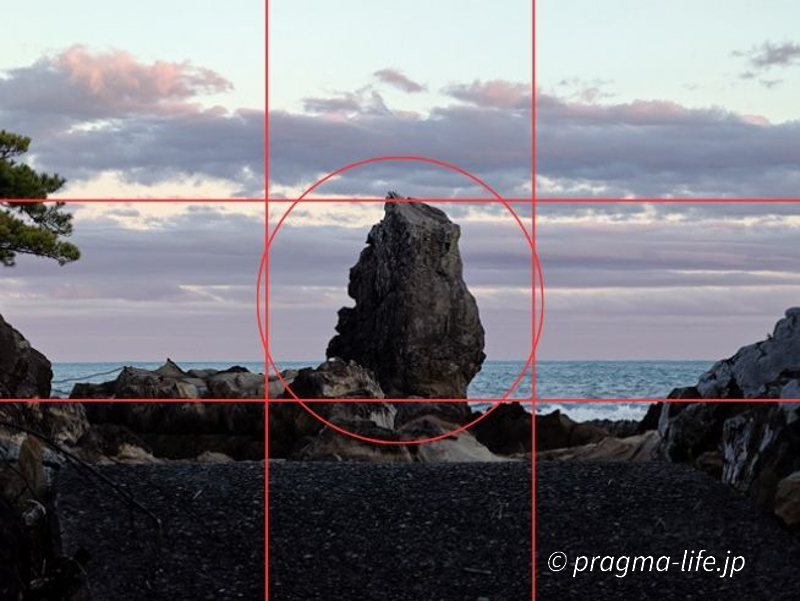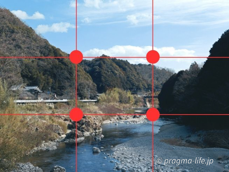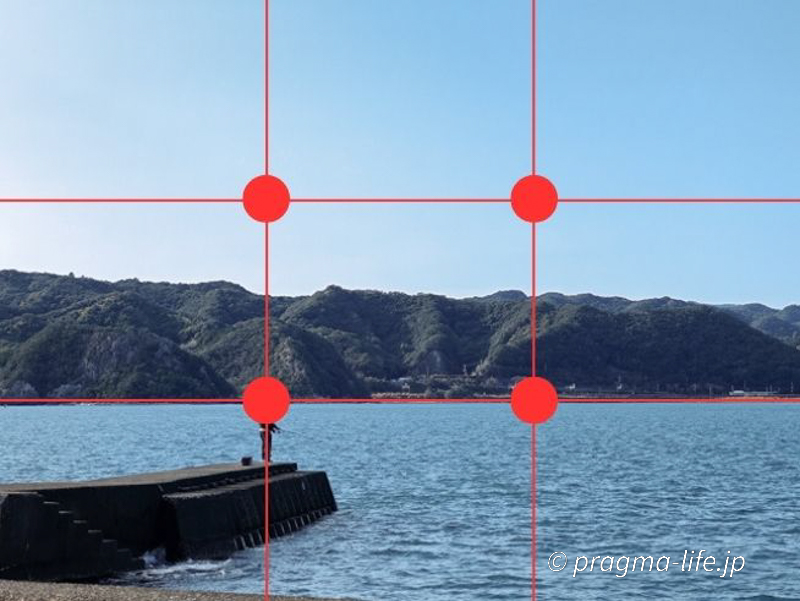 実際には、縦に2:1の割合で分割したり、グリッド線の交点にメインの被写体を置くように撮影するだけでも大丈夫です。こちらも二分割構図と同じく写真に安定感が生まれ、バランスの良い写真になります。