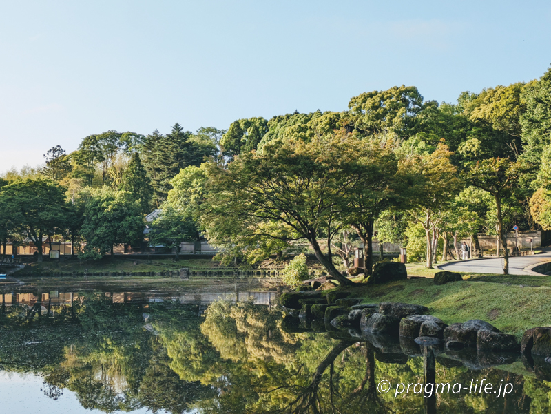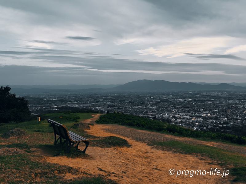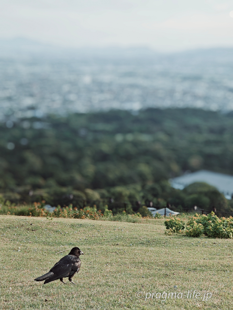 手前の芝生、奥の森、さらにその奥の街並みと空で三分割のグラデーションに
