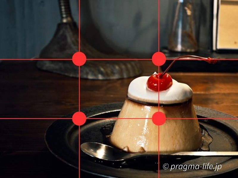 上側の横線に壁とテーブルの境界を合わせる。また、右下の交点にプリンを配置してバランスを取る