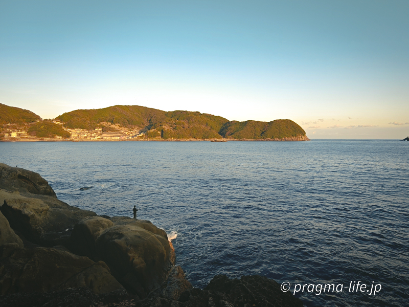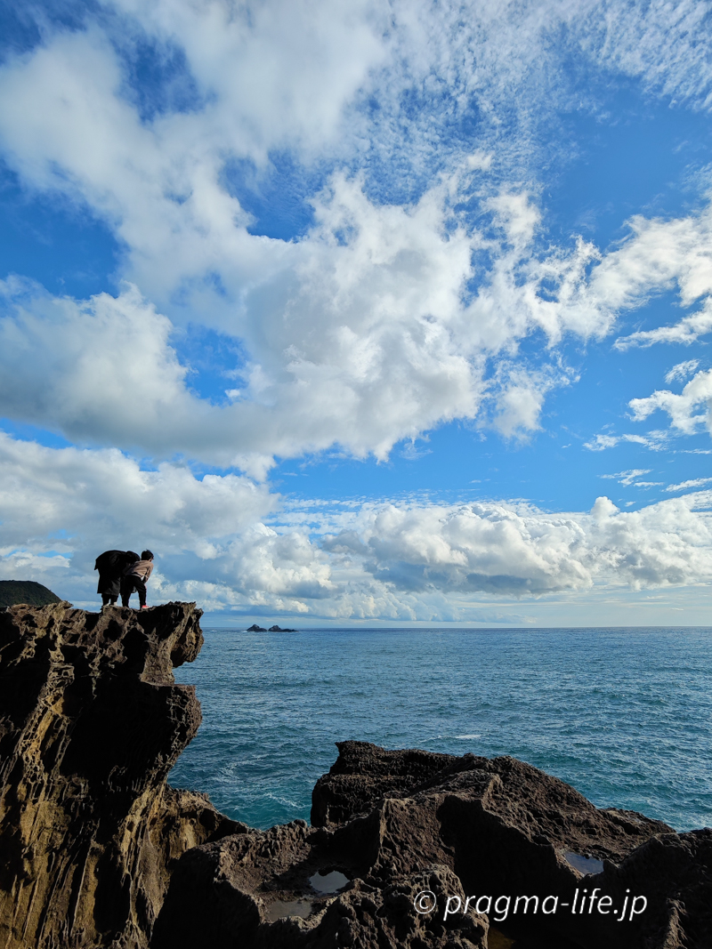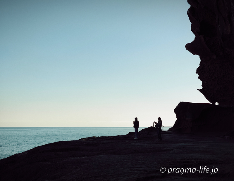 対比構図は二つ以上の被写体や、被写体と風景など何かしらの対比をつくる構図で、必ずしもグリッド線に従う必要はありません。様々なシーンで使えますが、以下の作例は人と風景を対比させることで、海と空の雄大さを表現しています。