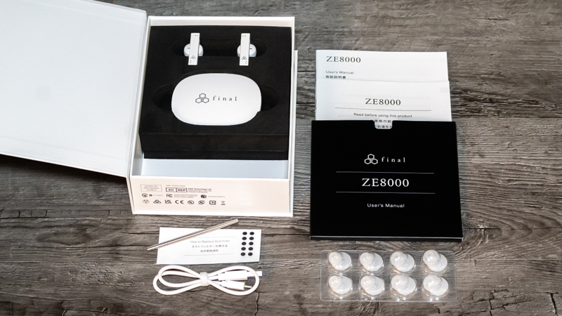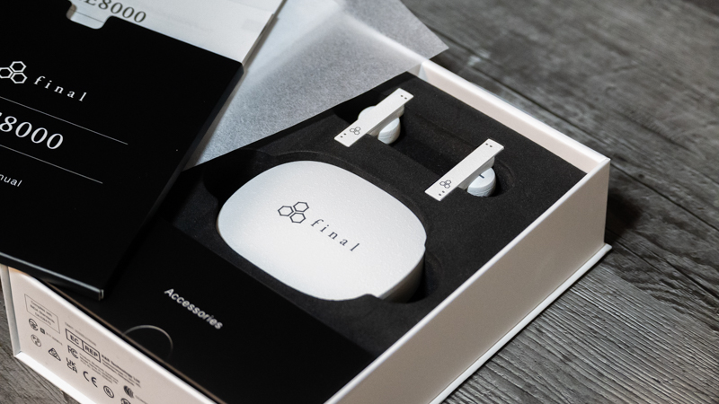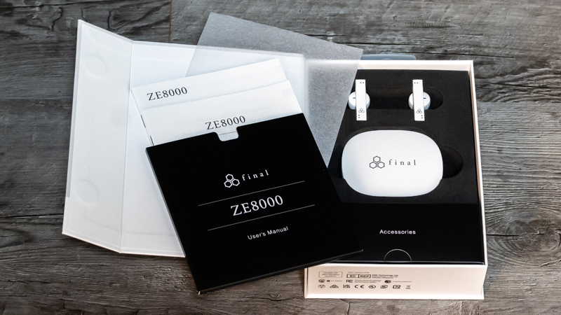 上蓋を開けるとイヤホンやケース、解説書などが登場。完全ワイヤレスイヤホンの多くは、最初からケースに入っているものが多いのですが、final ZE8000は分けて入れられていました。