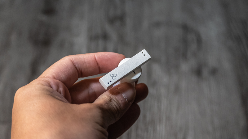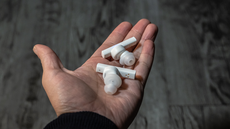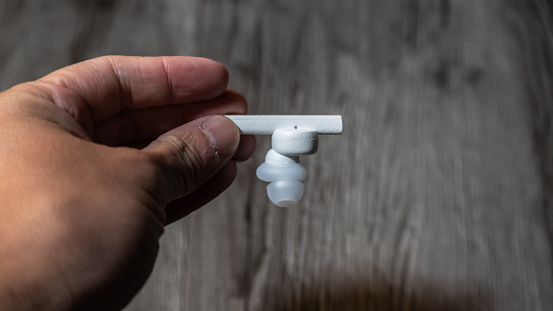 そして、イヤホン自体も大型の部類。角ばったスティック、大きなハウジング、独特な形状のイヤーチップの組み合わせは異様さすら感じます。
