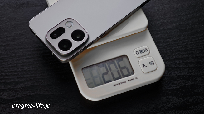 OPPO Find X9の本体は実測で約206gでした。公称重量は約203gなので、3gの差は貼付されているフィルム分でしょうか。