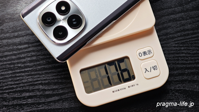 POCO M8 5Gの本体は実測で約176gでした。公称重量よりなぜか軽くなっていますが、軽い分にはむしろ良いことです。