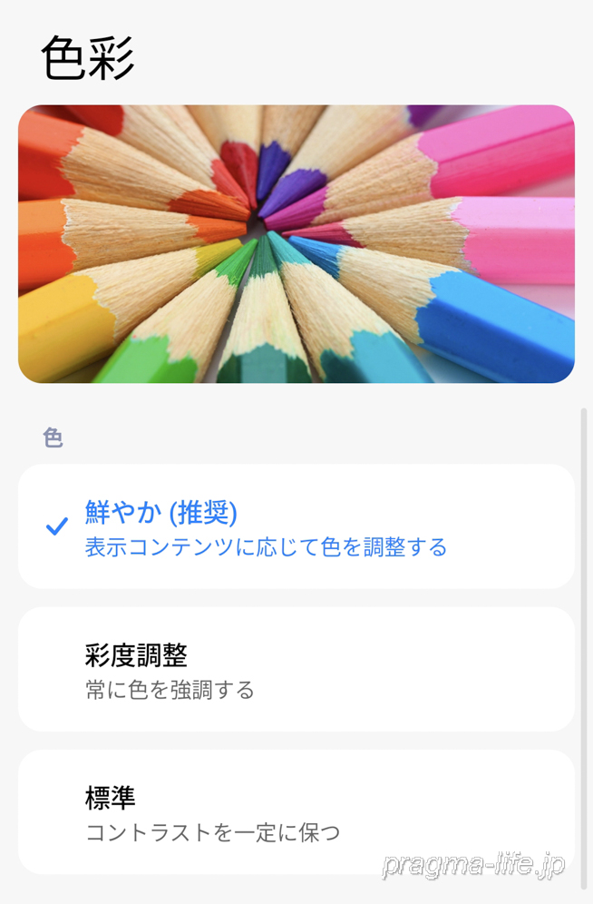 色彩はデフォルトでは「鮮やか」に設定されていますが、よりコントラストを抑えた設定も可能となっています。