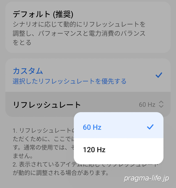 また、リフレッシュレートはデフォルトでは自動調整となっていますが、60Hz or 120Hzの固定リフレッシュレートにも設定可能でした。