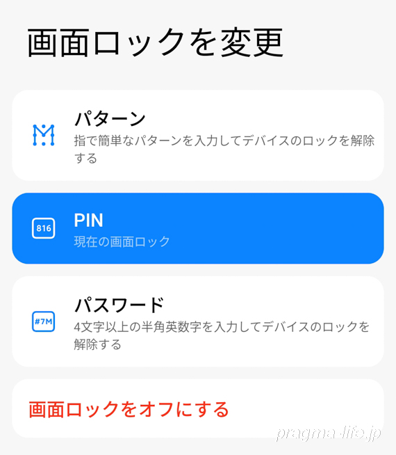 また、基本のロックはパターン、PIN(最大8桁の数字)、パスワードの3種類となっていました。