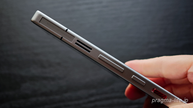 この物理スイッチがあるだけで、ガジェット好きとしてはワクワクしてしまいます。そして次に目を引くのが、側面の吸気・排気スリットです。