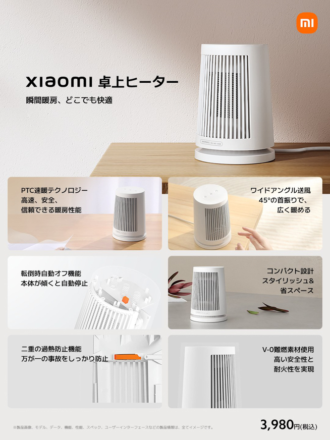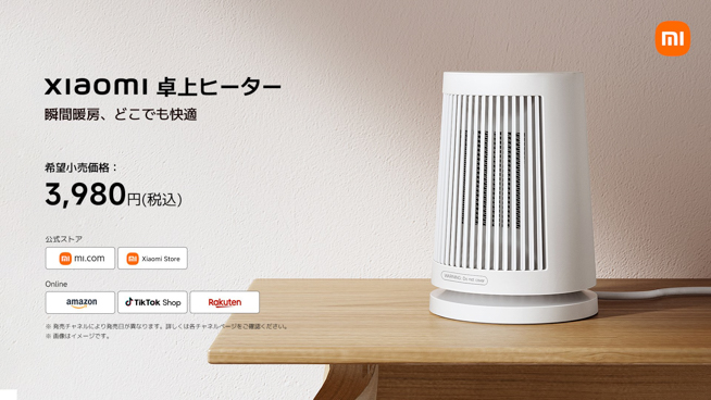 Xiaomi 卓上ヒーターの希望小売価格は税込3,980円。Xiaomi公式サイト(mi.com)のほか、Amazon、Xiaomi公式 楽天市場店等で販売されます。