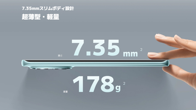 寸法は、縦164mm、横75.42mm、厚さ7.35mmと薄型で、重量も178gと軽量なスマートフォンになっています。