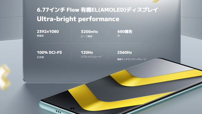 解像度はFHD+(2392×1080)で、3200nitsのピーク輝度や最大120Hzのリフレッシュレートに対応。