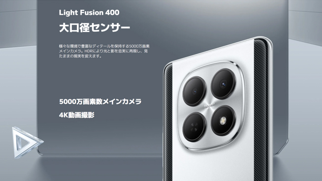 メインカメラには1/2.88インチのセンサー「Light Fusion 400」が採用されており、4K高解像度の動画撮影に対応。OIS(光学式手振れ補正)は非搭載です。