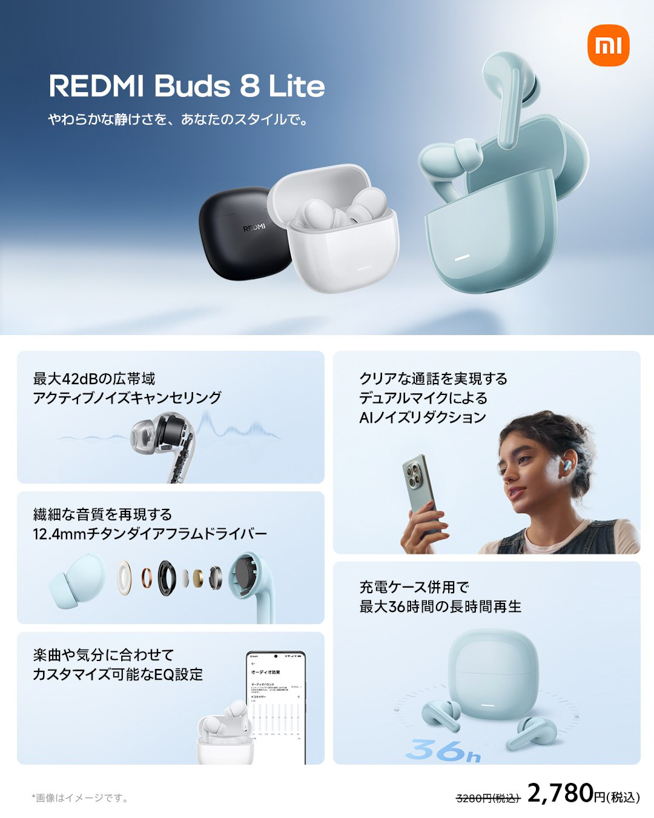 REDMI Buds 8 Liteは、高いノイズキャンセリング性能を備えた完全ワイヤレスイヤホンです。