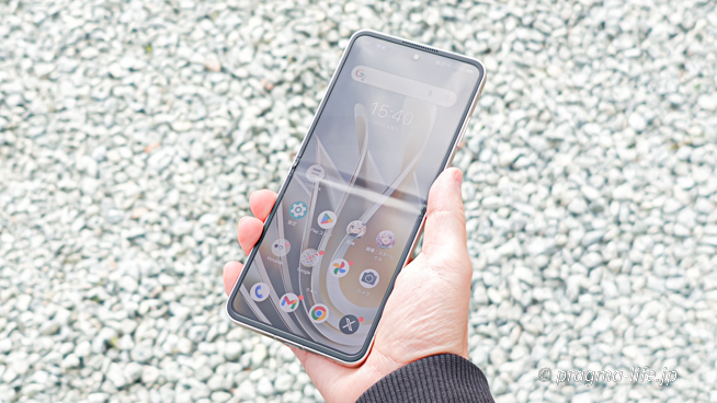 開いた状態で使えるメインディスプレイは約6.9インチの大画面です。コンパクトに折りたたんだ状態では、約1.43インチの丸型ディスプレイが使用可能。折りたたんだ状態で通知を確認したり、電話に応答したりすることが可能です。