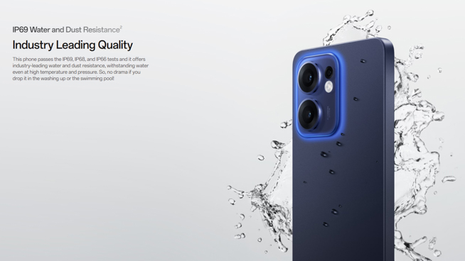 OPPO Reno13 F 5GはIP69/IP68/IP66の防塵防水に対応。80℃の高温水や水深2m環境での30分間の水没に耐える性能を持っているとのこと。