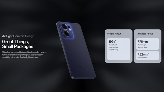 寸法・重量では、OPPO Reno13 F 5Gは厚さ約7.76mm(or 約7.82mm)、重量約192gとなっています。
