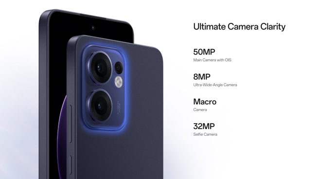 OPPO Reno13 F 5Gは、5000万画素メイン(+OIS)、800万画素超広角、200万画素マクロのトリプルカメラを搭載。また、インカメラは3200万画素です。