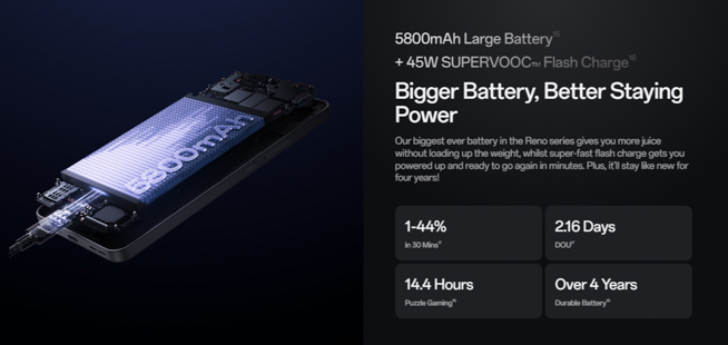 OPPO Reno13 F 5Gは5800mAhもの大容量バッテリーを搭載しており、充電出力は最大45Wとなっています。