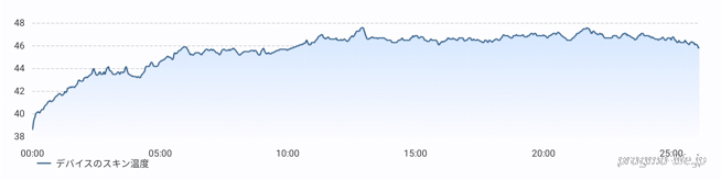 表面温度は46℃を少し超えた程度で安定。また、30分のプレイ終了後のバッテリー温度を別のアプリで確認したところ、人肌程度の37℃でした。バッテリーに大きな負担をかけないようしっかり制御されているようです。