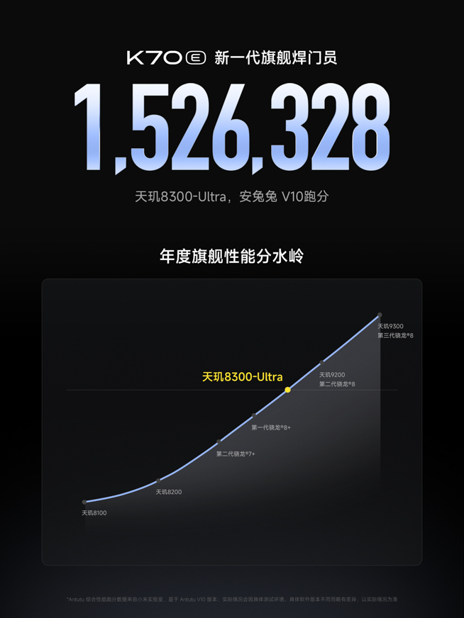 Redmi K70EはSoCにMediaTek製「Dimensity 8300-Ultra」を搭載する準ハイエンドの5Gスマートフォンです。5000mm²の大型ベイパーチェンバー冷却も備えており、AnTuTuベンチマークでは150万点を超えるスコアを発揮するとのことです。