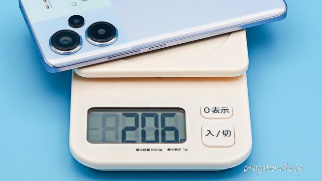 本体(フィルム貼付済み)は実測で206g。本体重量は公称で約204.5gだったので、フィルムが約1.5gほどになる計算です。