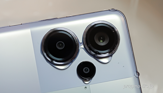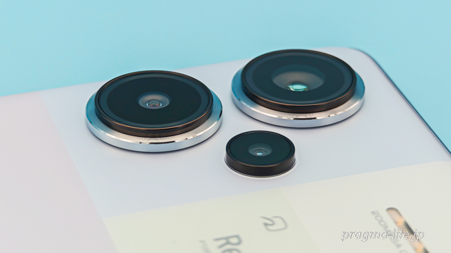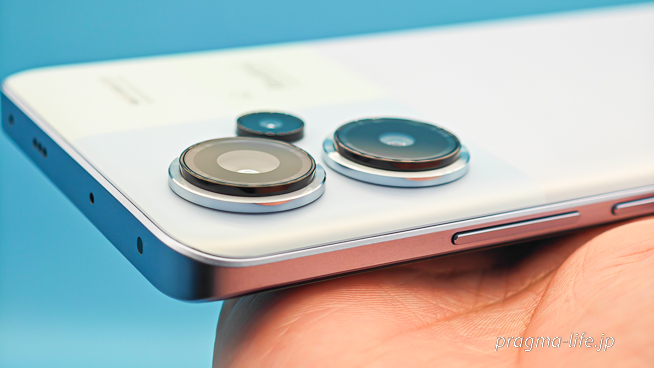 最近のスマートフォンの多くが、カメラに大きな台座を設けてそれぞれのレンズを配置していますが、Redmi Note 13 Pro+ 5Gは台座無し。すっきりとした印象で、カメラの出っ張りは10円玉2枚分よりわずかに薄い程度でした。