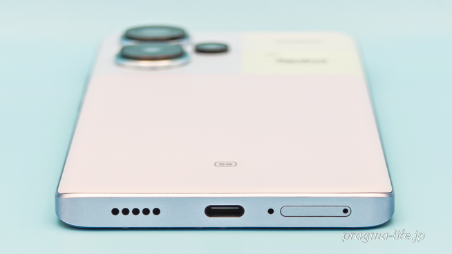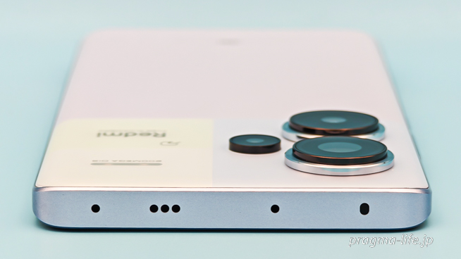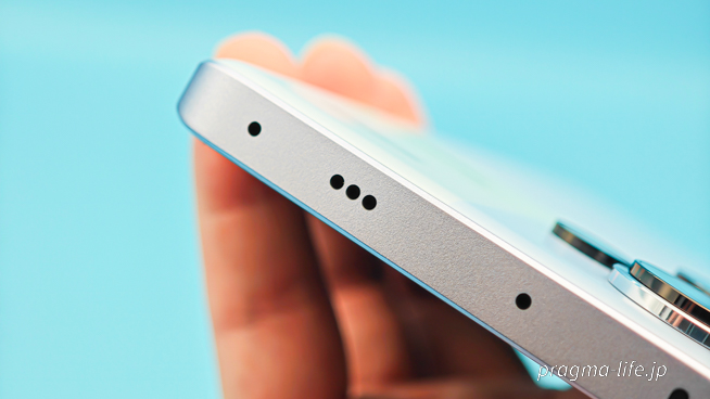 普通、ミドルレンジのスマートフォンはデュアルスピーカーでも、片方は画面上部にある電話用スピーカーと兼用の場合が大半。一方、Redmi Note 13 Pro+ 5Gは天面・底面にそれぞれスピーカーが備えられ、まるでハイエンドモデルのような配置です。