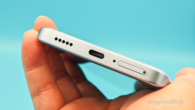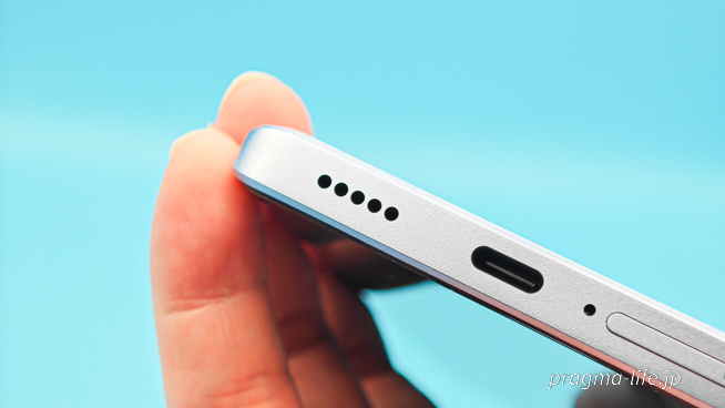 底面にはスピーカー穴、USB Type-C充電ポート、マイク穴、SIMスロットがあります。
