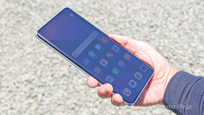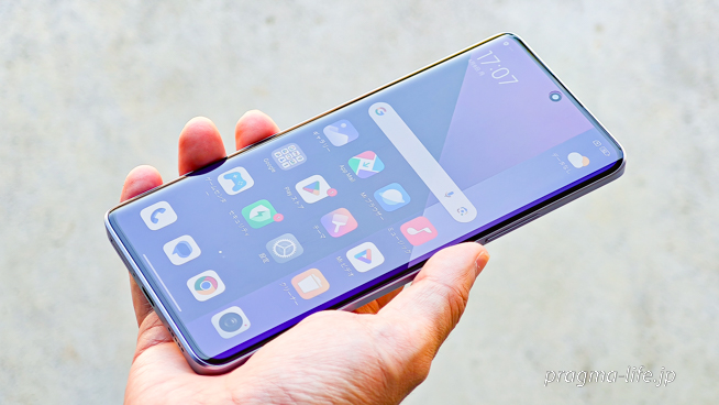 これにより、大きな画面でありながら横幅が抑えられ(74.2mm)、持ちやすくなっています。