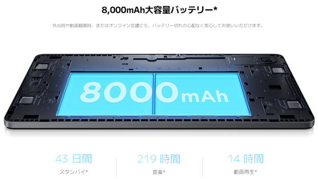 その他、正面に500万画素、背面に800万画素のカメラをそれぞれ搭載し、バッテリーは8000mAh。43時間のスタンバイ、219時間の音楽再生、14時間の動画再生が可能とのこと。充電は10Wです。