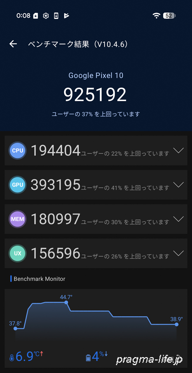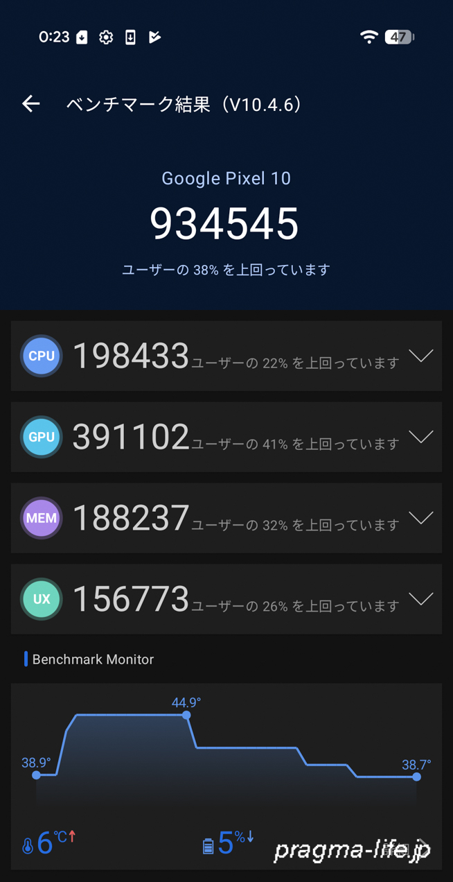 その処理性能を測るために、AnTuTuベンチマーク(Ver10.4.6)で計測を行いました。強い負荷への耐性を調べるために3回連続で行っています。