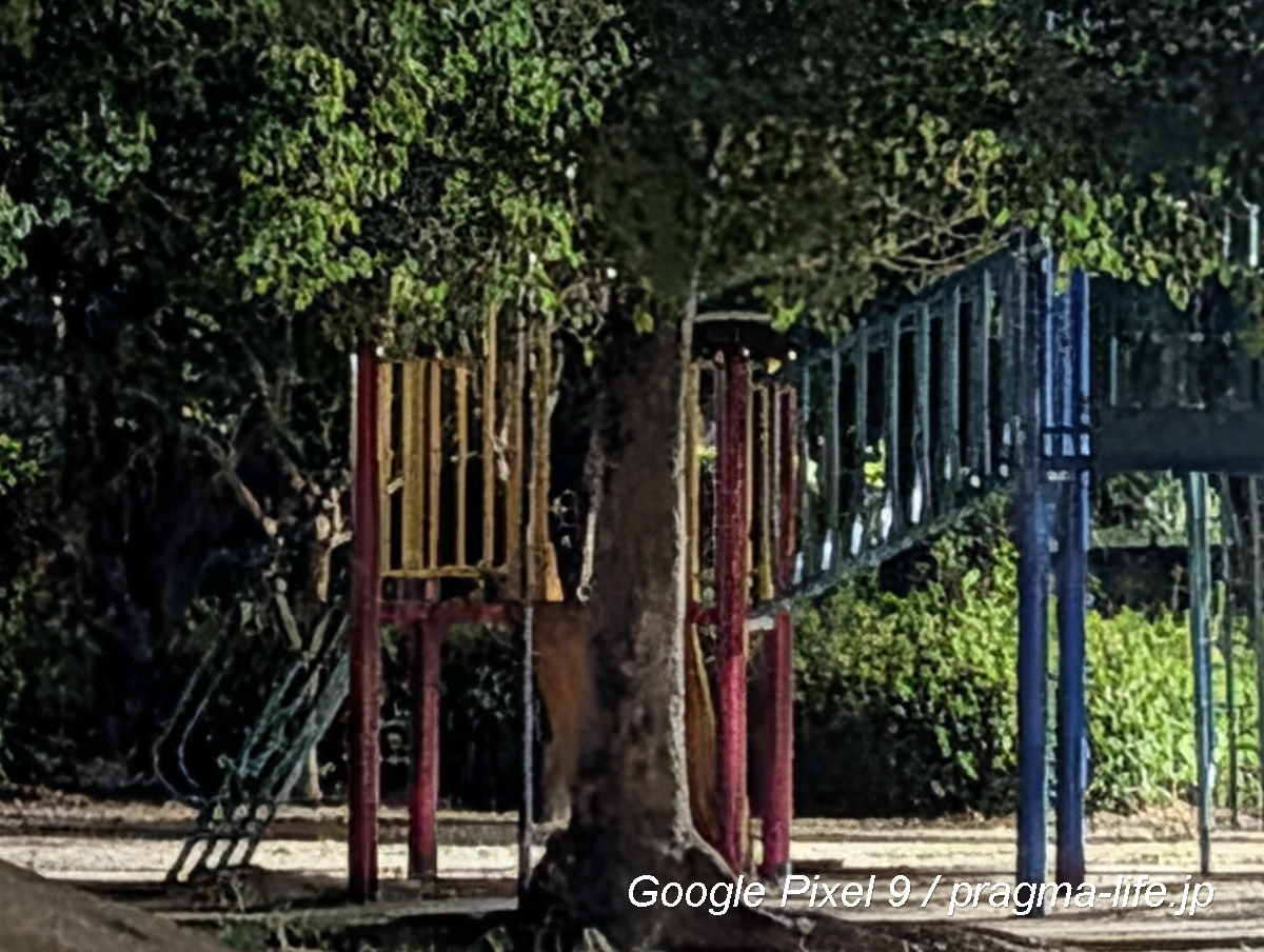 Pixel 10は潰れている部分も多いのですが、Pixel 9の方はまだ木の葉っぱもディティールが残っています。