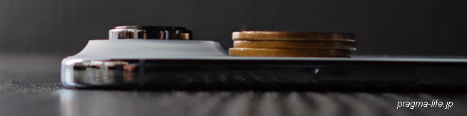 また、筐体は全体的に薄くなっている一方で、カメラ部分の出っ張りは大きく十円玉およそ3枚分